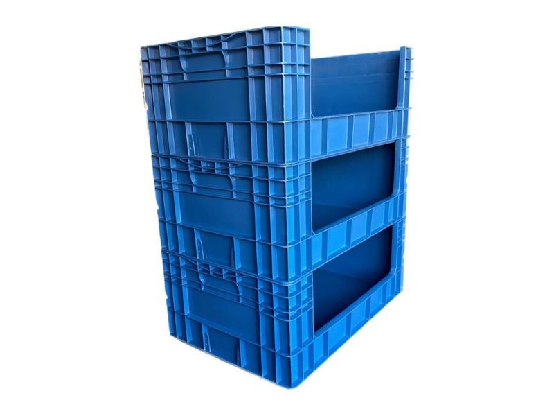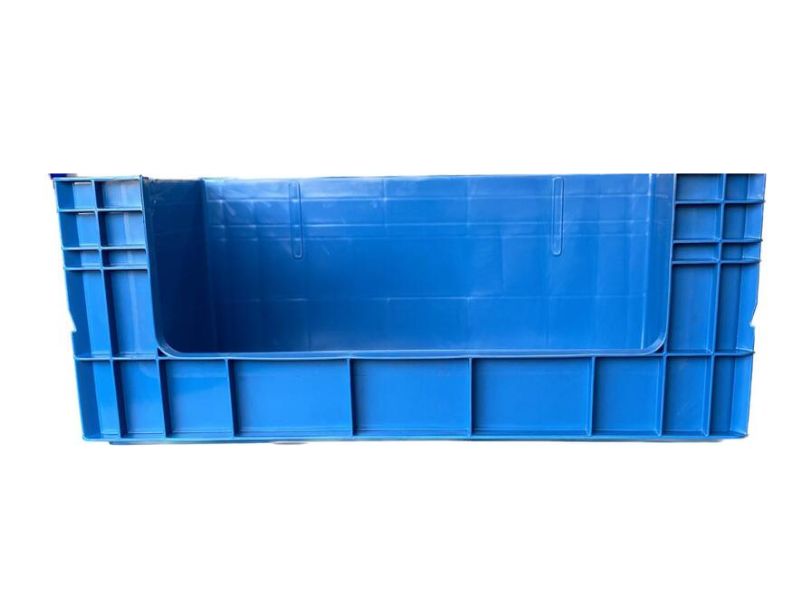 Abertura na parte Lateral. Cabeceira, alças e fundo fechados. Paredes internas e fundo lisos para não danificar o produto. Empilhável. Fácil higienização. Espaço para gravação nas laterais e testeiras. Paletizável. Com porta cartão na testeira.