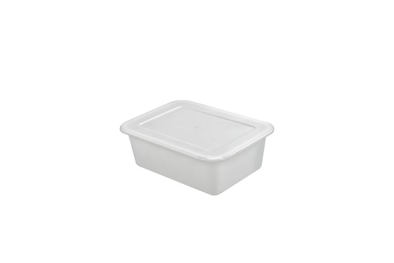 Bandeja e tampa produzidas em Polipropileno virgem, na cor natural, 100% polidas, atóxicas e de fácil higienização.