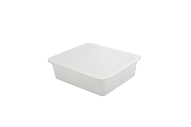 Bandeja e tampa produzidas em Polipropileno virgem, na cor natural, 100% polidas, atóxicas e de fácil higienização.