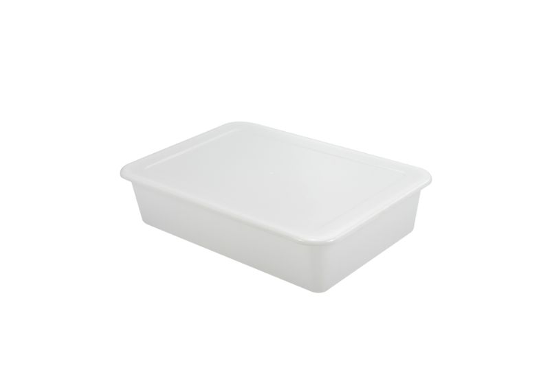 Bandeja e tampa produzidas em Polipropileno virgem, na cor natural, 100% polidas, atóxicas e de fácil higienização.